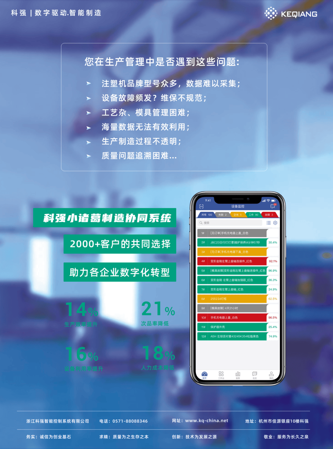 浙江科强打造的小诸葛工业互联网平台,是注塑产业数字化转型的强力引擎。平台聚焦注塑型企业车间管理场景,以物联网、MES系统和制造数据分析模型为核心,构建了覆盖计划排产、过程控制、设备管理、质量追溯、工艺标准化、能源监测、智能分析的全流程业务体系。平台通过实时采集注塑机数据,结合工艺知识库实现异常秒级预警与闭环处理,推动生产效能与管理精度的双重飞跃,为离散制造行业提供了可复制的 “降本提质” 标杆方案。